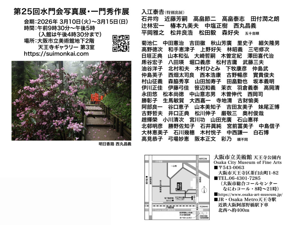 2026/3/10(火)〜3/15(日)に第25回水門会写真展・一門秀作展を大阪市立美術館B2F天王寺ギャラリーで開催致します。今回は水門会会員の作品に併せ、会員の各教室、クラブ員の作品も一挙に展示され見ごたえのある華やかな展示会になります。皆さまのお越しを心よりお待ち申し上げます。